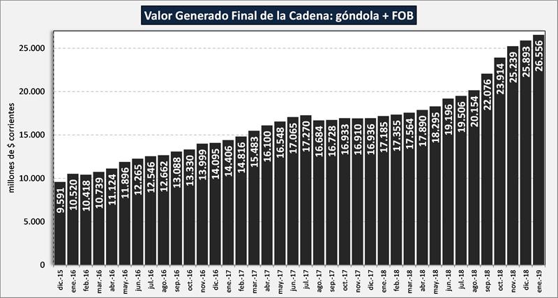 En el gráfico de arriba se puede observar la “facturación” total de la cadena de valor que en el mes de enero de 2019 fue de $ 26.556 millones lo que representa un incremento del 2,6% respecto al mes anterior y del 54,5% en comparación con igual mes del año anterior.