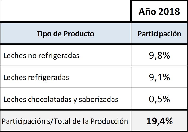 El cuadro siguiente indica que del total de la leche producida en 2018, el 19,4% se destinó a la elaboración de leches refrigeradas y no refrigeradas.