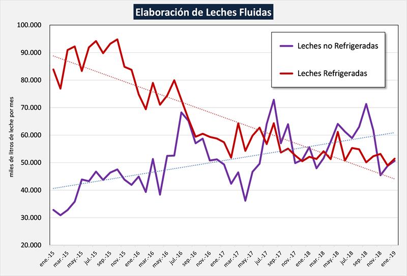 Como puede observarse en el gráfico de arriba hay una pronunciada tendencia a disminuir la elaboración de leches refrigeradas, situación inversa, no tan pronunciada respecto a la tendencia de elaboración de leches no refrigeradas.