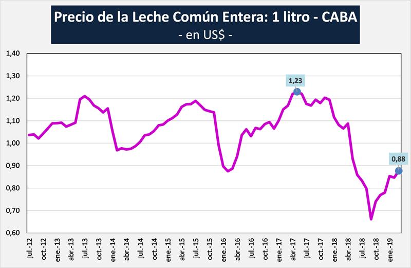A continuación hemos tomado la serie de precios de Leche Común Entera que publica mensualmente la Dirección General de Estadísticas y Censos del Ministerio de Economía y Finanzas del Gobierno de la Ciudad de Buenos Aires y la hemos actualizado por el Indice de Precios al Consumidor (IPC) de INDEC y también convertimos los precios de la leche en dólares mediante la cotización del dólar tipo vendedor que publica el BCRA.