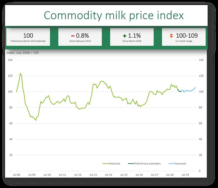 El MPI incluye: un índice australiano de precios de la leche de los productos básicos de exportación como queso, manteca, leche descremada en polvo y leche entera en polvo, más un pronóstico para un año. Un índice regional y retrospectivo del precio de la leche al productor con datos provenientes de productores de leche.