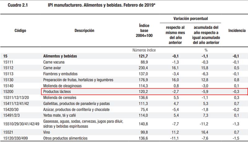 En los productos lácteos el índice presenta una disminución del 2,7% respecto a igual mes del año anterior, y el acumulado anual es del 5,9% respecto a igual acumulado del año anterior.