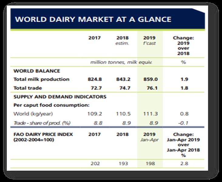 Se pronostica que la producción mundial de leche aumentará en 1,9% (16 millones de toneladas) a 859 millones de toneladas en 2019. Se anticipa que todas las regiones principales verán crecimiento, aunque en tasas más lentas que el año pasado. India, Pakistán, la Unión Europea (UE), los Estados Unidos de América, Nueva Zelanda y Brasil, se espera que sean los principales contribuyentes.