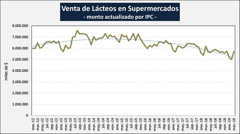 Venta de Lácteos en Supermercados y Autoservicios Mayoristas 5/6/2019Ventas Totales en Supermercados a precios corrientes y a precios constantes: Las ventas a precios corrientes para marzo de 2019 relevadas en la Encuesta de Supermercados sumaron un total de 51.119,1 millones de pesos, lo que representa un aumento de 14,6% respecto al mes anterior y un aumento de 39,9% respecto al mismo mes del año anterior. Las ventas a precios constantes de diciembre de 2016, durante marzo de 2019, sumaron un total de 24.673,1 millones de pesos, lo que representa un aumento de 9,5% respecto al mes anterior y una caída del 14,5% respecto a marzo de 2018. Respecto a los medios de pago: ![]() Los Lácteos en Supermercados: Cabe recordar la estructura comercial de los lácteos, donde el 21% se destina a Mercado Externo, 79% a Mercado Interno, de ello el 4% del total nacional son Ventas Industriales e Institucionales, el 7% aproximadamente para Hoteles, Restaurantes y Catering, con lo que el 67% de la producción nacional se comercializa por medio de la venta minorista, que se reparte más o menos en tercios entre Super/Hipermercados, Autoservicios y Mayoristas en venta minorista y Negocios de Proximidad (estructura año 2018). Respecto a la venta de lácteos en los supermercados según los datos de INDEC, fueron de $ 5.703,4 millones para el mes de marzo de 2019, lo que representa un aumento del 19,5% respecto al mes anterior (+7,9% a igual cantidad de días) y un incremento del 42,9% más que marzo de 2018 (la inflación-IPC fue del 3,4% y 55,8%, respecto al mes anterior y anual, respectivamente). Considerando una venta en el mercado doméstico de 582 millones de litros de leche equivalentes para marzo de 2019 y en función al Valor por Litro Equivalente de IAPUCO para el Mercado Interno de $ 42,92/litro, la facturación total del mercado interno fue de $ 24.958 millones con lo que la venta de supermercados de $ 5.900 millones, representan el 23,6% de las ventas totales en el mercado interno. Como puede observarse en el gráfico siguiente la participación de los lácteos en la venta de los supermercados, incidió en un 11,2% de sus ventas totales, 0,3% más que igual mes del año anterior (marzo 2018 = 10,9%). ![]() La distribución de esas ventas en el territorio nacional se visualizan en el gráfico siguiente, donde es de remarcar que la provincia de Buenos Aires representa el 59,5% de las ventas de lácteos en supermercados de todo el país y si agregamos Córdoba y Santa Fe, se concentra en esas tres provincias casi tres cuartas de las ventas totales. ![]() Si vemos la evolución de las ventas de lácteos en supermercados, actualizadas por el índice de precios al consumidor, podemos observar un tendencia decreciente desde 2016 a la fecha. Los valores en moneda constante de marzo 2019, son 3,1% superiores al mes anterior (igualando a 31 días) y 7,7% inferiores al mismo mes del año anterior. ![]() Venta de Lácteos en Autoservicios Mayoristas: INDEC ha incorporado en su publicación el canal de autoservicios mayoristas, el mismo se caracteriza por comercializar sus productos al por mayor tanto en forma directa a los consumidores finales como con fines de reventa. Las tareas realizadas se orientaron a establecer una metodología para determinar las ventas totales que se deben computar para observar la evolución de las ventas a los consumidores finales que adquieren los productos por este canal de comercialización. El cuestionario aplicado a las empresas de autoservicios mayoristas es el mismo que el de la encuesta de supermercados y tiene en cuenta solo aquellas ventas con facturas o tickets emitidos por un responsable inscripto a un consumidor final, monotributista y/o exento. A continuación se presentan los gráficos que muestran la participación de los lácteos en ese canal comercial y la distribución regional: ![]() ![]() elaborado por el OCLA con datos del Informe de INDEC