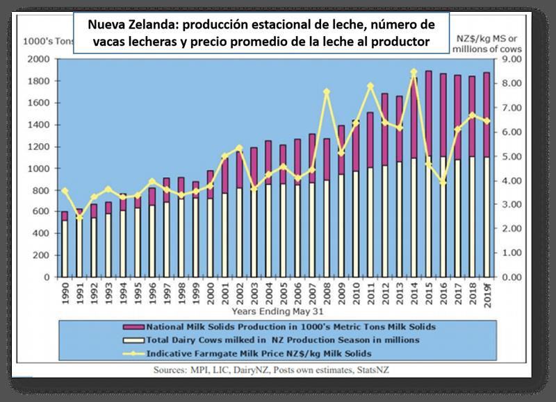 Se espera que los agricultores reciban un precio de la leche de aproximadamente NZ $ 6.45/ kilogramo de solidos (kg MS), (USD 4,30/kg MS, +/- 33 centavos de dólar por litro), para el año que termina en mayo de 2019. Los precios de la leche para 2019/2020 se pronostican en NZ$ 7,00 / kg MS (USD 4,62/kg MS, +/- 35 centavos de dólar) o más, lo que debería significar que la mayoría de los agricultores invertirán en alimentos complementarios si enfrentan un déficit de crecimiento de pastos en la segunda mitad del año.