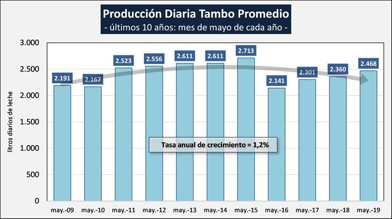 Sobre la base de la producción mensual y la cantidad anual estimada de tambos (sobre la base de la cantidad de tambos publicada por SENASA para 2018, menos un 4%), podemos inferir el tamaño del tambo promedio, unos 2.468 litros de leche diarios para mayo de 2019, un 4,6% más que el año anterior (cabe acotar que la producción total interanual en mayo 2019, cayó un 1,7%). Si evaluamos su comportamiento en el tiempo, a pesar de la disminución en el número de unidades productivas y en el número de vacas (número no corroborado con los datos actuales de SENASA), el tambo promedio presenta en el período 2009-2019 una tasa de crecimiento acumulada anual del 1,2%, lo que permite el sostenimiento de los niveles productivos agregados a nivel país.