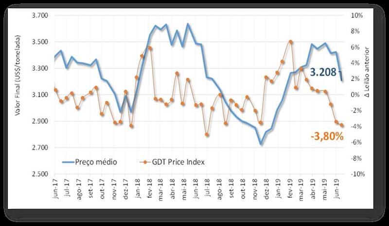 La mayor oferta hizo que la última subasta del GDT, realizada este martes, cayera un 3,4%. Con eso, la subasta acumulad su tercera caída seguida. El volumen negociado fue de 24.239 ton., cantidad 22% mayor en relación al último evento. Y el precio promedio se quedó en 3.208/ton., menor nivel desde febrero/19. Observar gráfico 1.