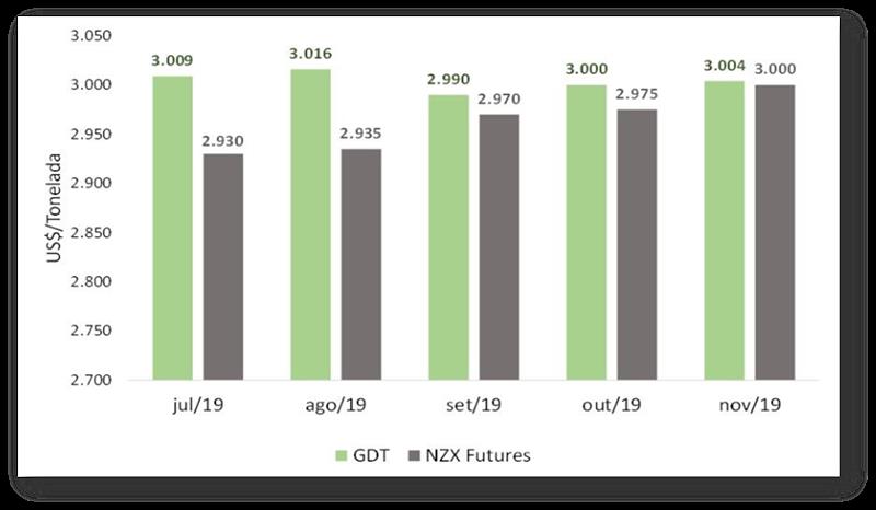 Gráfico 3. Precios futuros de leche en polvo GDT x NZX; elaborado por los autores con datos del Global Dairy Trade y NZX.
