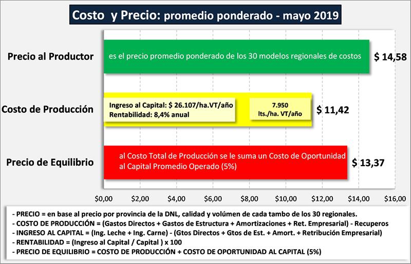 Si suponemos un tasa de rentabilidad exigida al capital del 5%, se debería genera un Ingreso Neto de $ 15.485/ha./año ($ 217.042 mensuales sobre la superficie considerada), que dividido por los 7.950 litros de leche de productividad promedio, deberían generar un ingreso neto unitario de $ 1,95/litro de leche. Por lo tanto el Precio de Equilibrio sería en este supuesto de $ 13,37/litro de leche ($ 11,42 de Costo Total + $ 1,95 de Rentabilidad al Capital), unos US$ 0,298/litro.