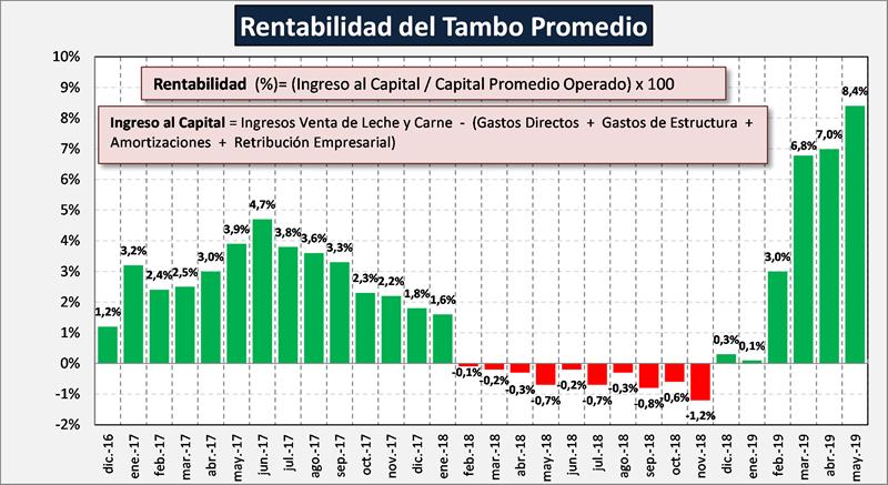 La mejora en la rentabilidad se debe fundamentalmente a un incremento interanual del precio de la leche (SIGLeA) del 130,0% y del costo de producción del 74,6% (Inflación – IPC = 57,3% y Tipo de Cambio = 89,8%). El costo de producción se vincula en diferentes proporciones con estos tres componentes: leche (mano de obra de ordeño y alquileres, por ejemplo), inflación (para algunos bienes y servicios no transables en el exterior) y variación en el dólar (semillas, agroquímicos, fertilizantes, suplementación, tasa de interés, etc.).