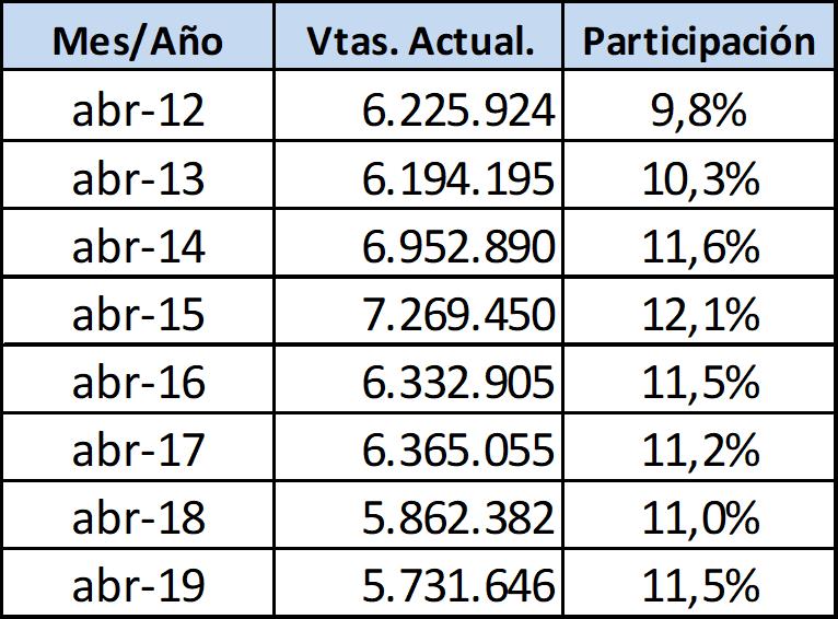 Las ventas a precios constantes de diciembre de 2016, durante abril de 2019, sumaron un total de 23.097,7 millones de pesos, lo que representa una caída de 6,4% respecto al mes anterior y una caída del 12,6% respecto a abril de 2018.
