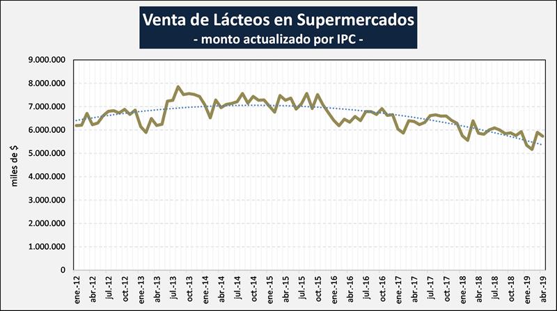 Respecto a las ventas de lácteos en los supermercados según los datos de INDEC, fueron de $ 5.731,6 millones para el mes de abril de 2019, lo que representa un aumento del 0,5% respecto al mes anterior (+3,8% a igual cantidad de días) y un incremento del 52,3% más que abril de 2018 (la inflación-IPC fue del 3,4% y 55,8%, respecto al mes anterior y anual, respectivamente).