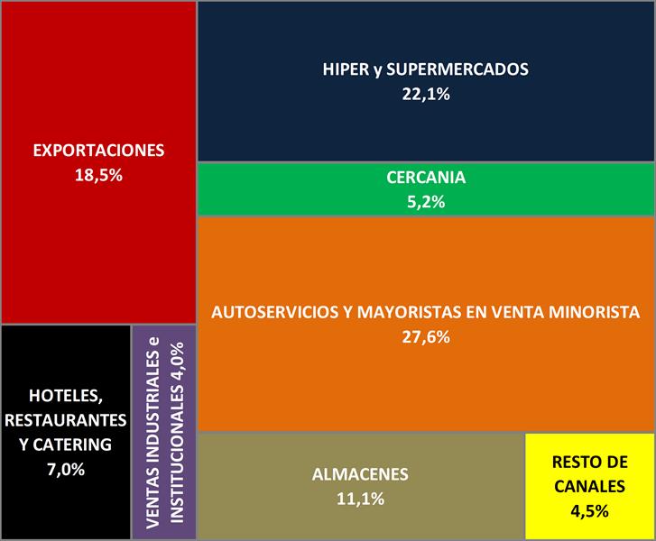 Observaciones: Cercanía comprende los negocios express de las grandes cadenas comerciales, autoservicios son básicamente los negocios denominados “asiático” y los autoservicios mayoristas que venden directamente a consumidor final y en el resto de canales se incluyen farmacias. Ventas industriales son aquellas que realiza la industria a otras industrias (dulce de leche para alfajores, cremas para helados, etc.) y las ventas institucionales comprenden a las licitaciones de leches para los planes sociales. HoReCa, o venta de productos para hoteles, restaurantes y catering, son las ventas de productos a esos destinos que realiza la industria en forma directa, por un canal especial o por distribuidores y que no son del sistema de distribución tradicional.