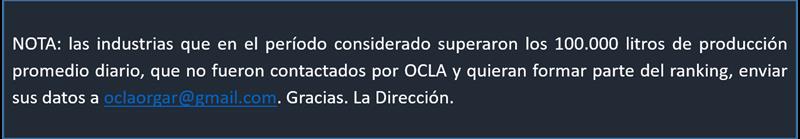 Por cuestiones de secreto estadístico, no es posible contar con la información de la DNL-Agroindustria, respecto a los litros procesados por cada industria, y tampoco se puede por motivos de defensa de la competencia recurrir por medio de las cámaras empresariales respectiva a ésos datos. Por lo tanto, OCLA procedió a solicitar a cada una de las empresas que tuvimos posibilidad de contacto (34), el dato respecto al volumen de leche procesada durante el período 1° de julio de 2018 y 30 de junio de 2019 por cada industria que estimamos estuvo alrededor o por encima de los 100.000 litros diarios procesados.