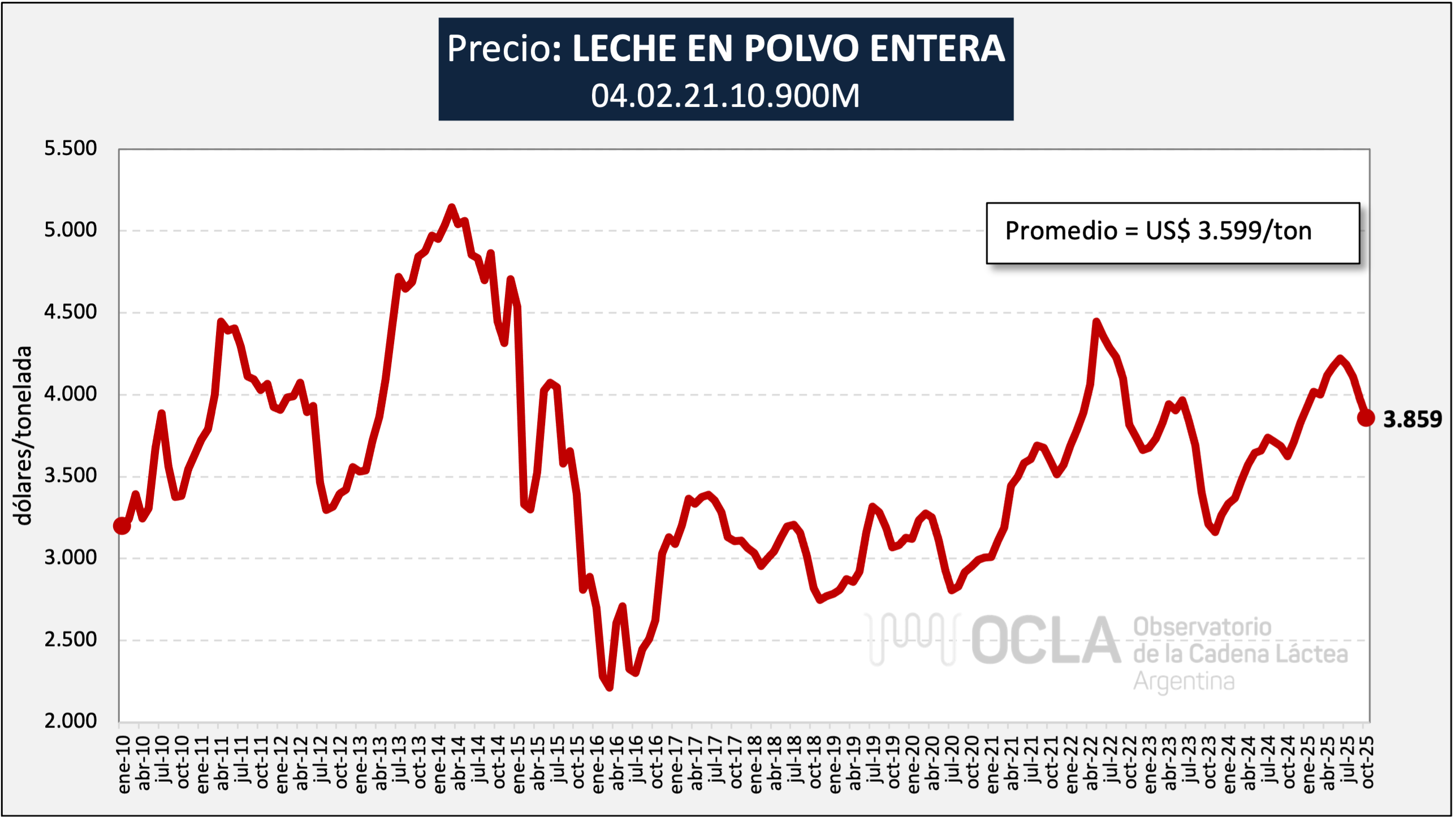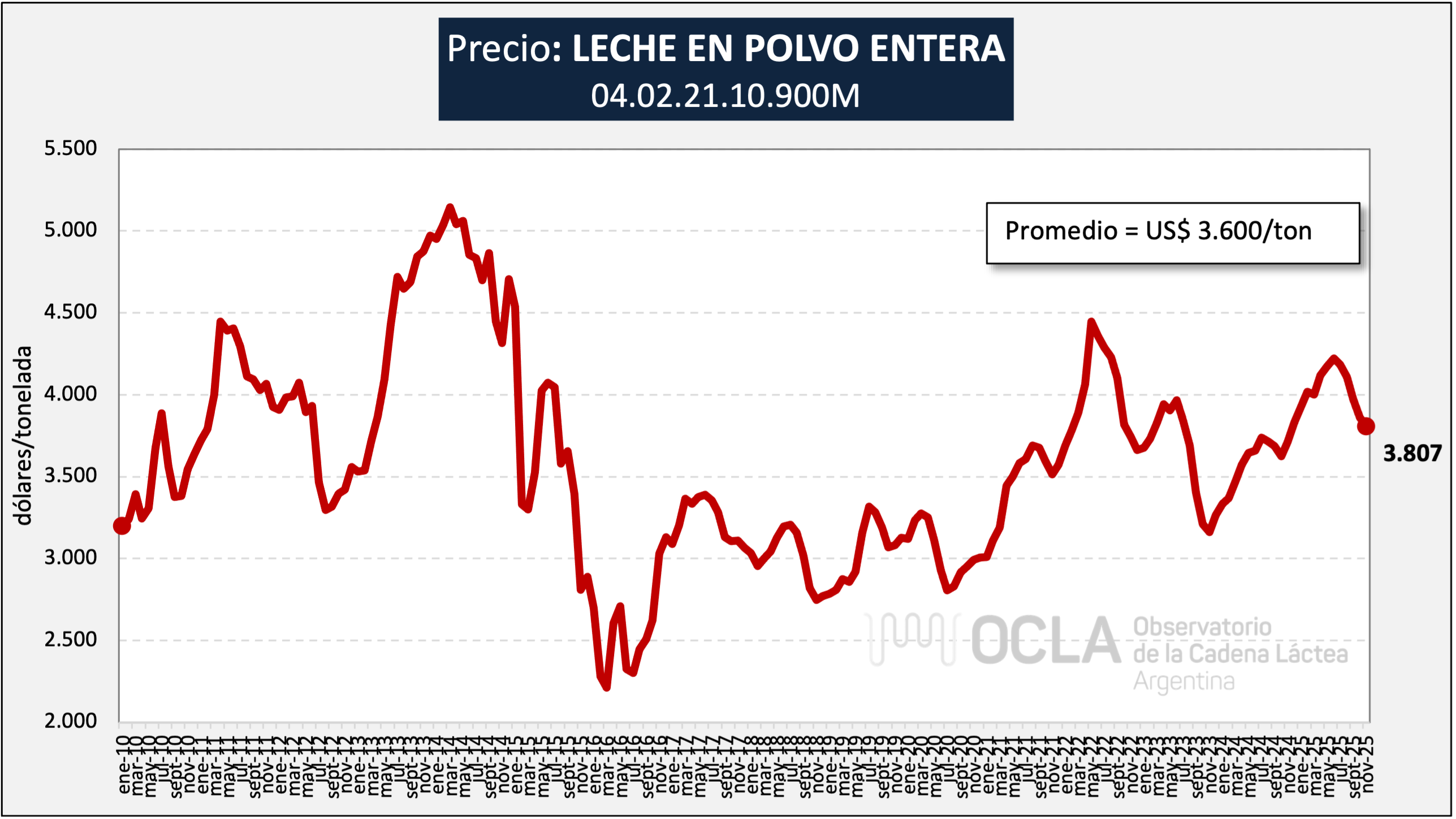 Precios promedios de exportaciones argentinas de Leche en Polvo Entera (Posición 0402.21.10.900M)