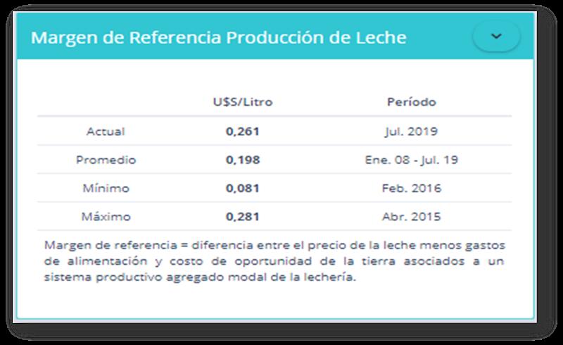En el cuadro puede observarse que el margen promedio para el mes de julio de 2019 fue US$ 0,261/litro de leche, éste margen es un 7,5% superior al del mes anterior y un 82,8% respecto al de igual mes del año anterior.