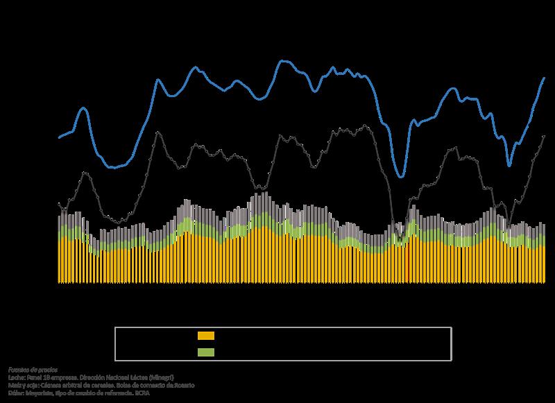 En el gráfico se muestra la evolución del “margen de referencia” del sector lechero argentino desde el año 2008. La barras indican el costo de alimentación (concentrado y silaje) y el costo de la tierra. La línea azul es el precio de la leche y la línea negra es el margen calculado. Para evitar problemas de tipo de cambio y variaciones del valor de la moneda local los precios se expresan en dólares. Las fuentes consultadas son la Dirección Nacional Láctea para el precio de la leche, la Bolsa de Comercio de Rosario para soja y maíz, y el tipo de cambio del BCRA.