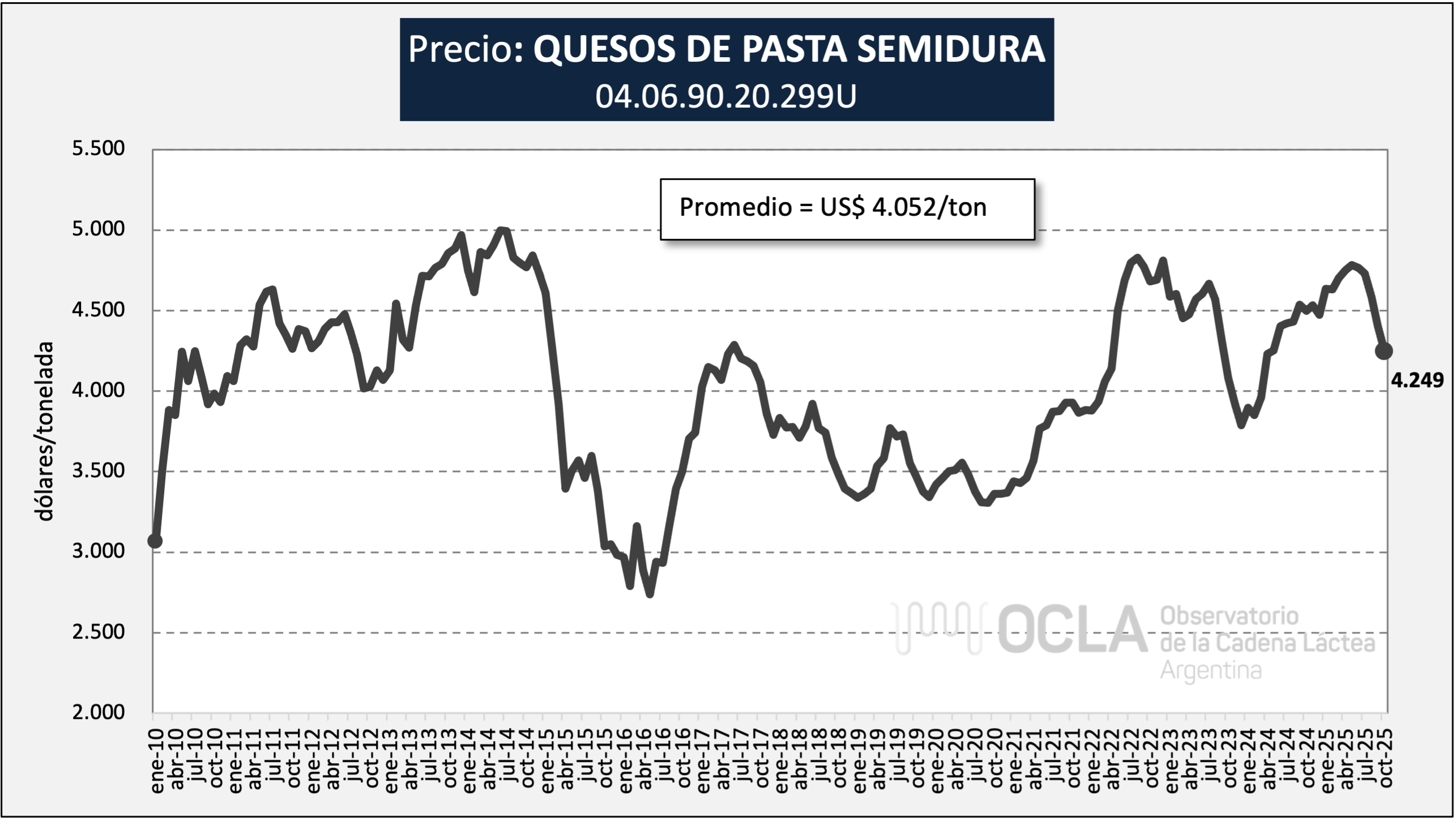 Precios promedios de exportaciones argentinas de Quesos de Pasta Semidura (Posición: 0406.90.20.299U)