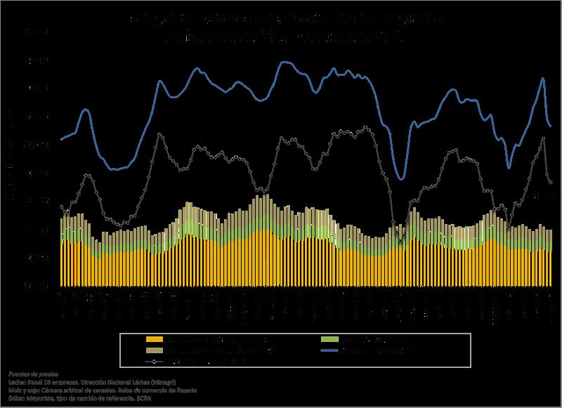 En el gráfico se muestra la evolución del “margen de referencia” del sector lechero argentino desde el año 2008. Las barras indican el costo de alimentación (concentrado y silaje) y el costo de la tierra. La línea azul es el precio de la leche y la línea negra es el margen calculado. Para evitar problemas de tipo de cambio y variaciones del valor de la moneda local los precios se expresan en dólares. Las fuentes consultadas son la Dirección Nacional Láctea para el precio de la leche, la Bolsa de Comercio de Rosario para soja y maíz, y el tipo de cambio del BCRA.