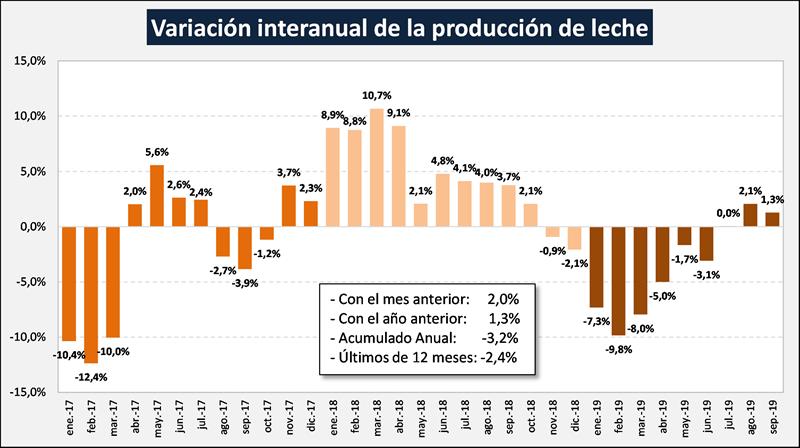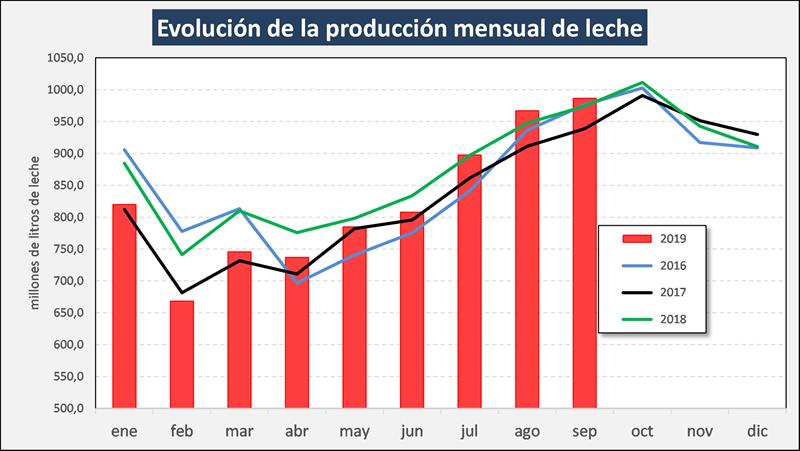 En el mes de septiembre de 2019 la producción fue de 986,5, millones de litros de leche, este valor representa una suba del 2,0% respecto al mes anterior (+ 5,4% en promedio diario) y un 1,3% más que igual mes del año anterior. El acumulado de los 9 meses de 2019 arrastra una caída del 3,2% respecto a 2018. La media móvil de los últimos 12 meses muestra un decrecimiento interanual del 2,4%.