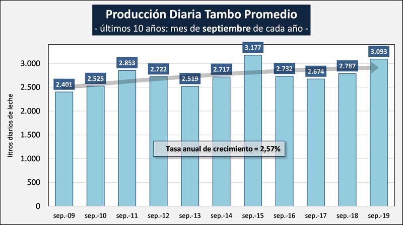 Sobre la base de la producción mensual y la cantidad anual de tambos (SENASA al 31/03/19), podemos inferir el tamaño del tambo promedio, unos 3.093 litros de leche diarios para septiembre de 2019, un 11,0% más que el año anterior (cabe acotar que la producción en septiembre 2019, fue 1,3% superior a septiembre de 2018). Si evaluamos su comportamiento en el tiempo, a pesar de la disminución en el número de unidades productivas y en el número de vacas, el tambo promedio presenta en el período 2009-2019 una tasa de crecimiento acumulada anual del 2,57%, lo que permite, a pesar a la reducción en las unidades productivas y en el rodeo, el sostenimiento de los niveles productivos agregados a nivel país.