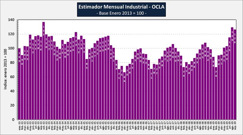 El EMI-OCLA asciende en septiembre de 2019 al valor 126, -2,4% respecto al mes anterior y 19,9% más que igual mes del año anterior. Desde que se analiza este indicador (81 meses), el promedio de los 6 septiembres anteriores llega al valor índice 109 vs 126 actual.