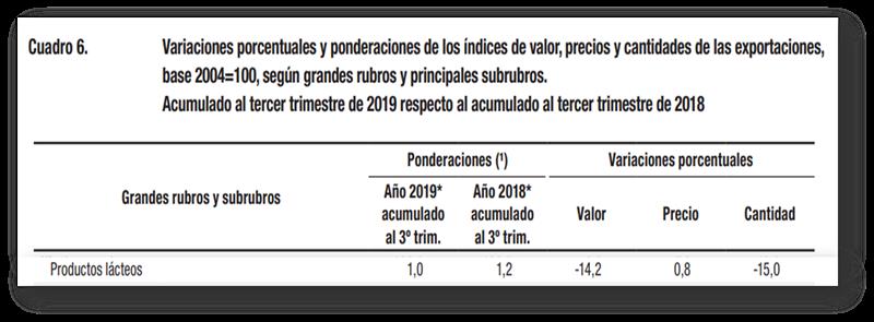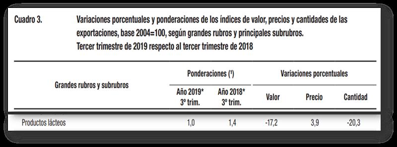 En el cuadro de arriba se compara la variación entre el 3° trimestre de 2019 e igual trimestre del año anterior. Puede observarse que los lácteos que participaron el 1,4% de las exportaciones totales, este año (3°trim.) lo hicieron el 1,0%. Por su parte las exportaciones en valor cayeron un 17,2%, un 20,3% en volumen y el precio unitario mejoró el 3,9%.
