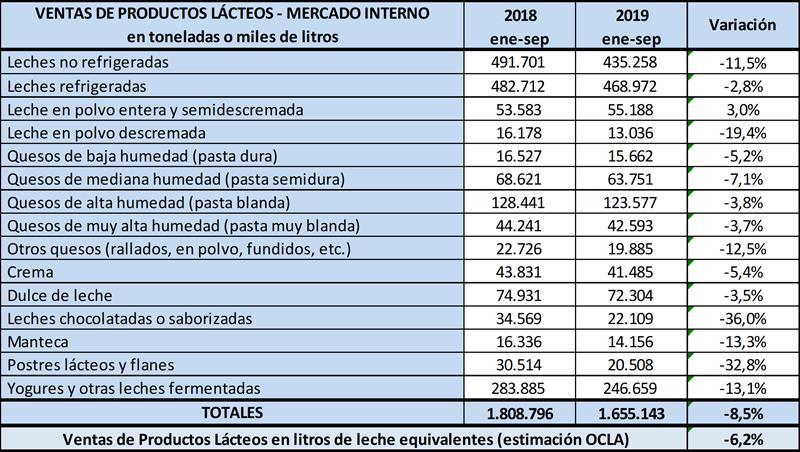 En el cuadro se observa una reducción del 6,2% en los litros equivalentes vendidos en el mercado interno durante el período enero-septiembre 2019 respecto a igual período del año anterior. La mayor reducción se observa en los productos de mayor valor agregado y/o unitario, tales como leches no refrigeradas, quesos procesados, leches saborizadas, yogures, flanes y postres.