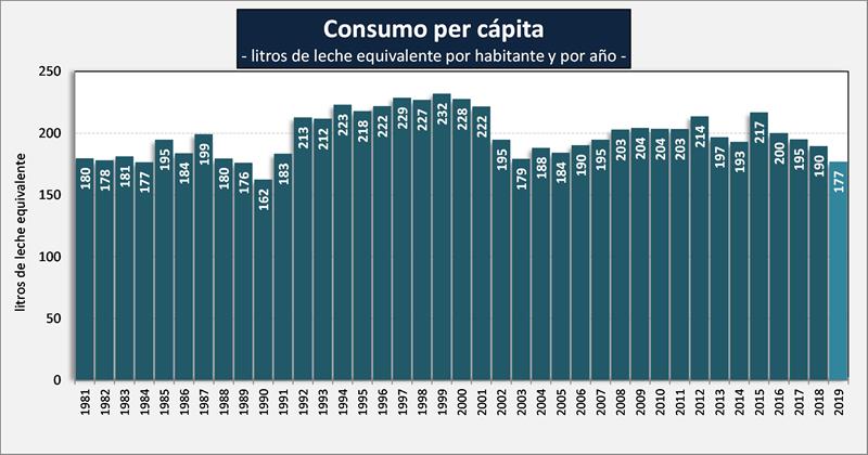 El consumo per cápita anualizado en base a los datos a septiembre, arroja un valor de 177 litros por habitante y por año, lo que representa una disminución del 5,9% respecto al año anterior y es uno de los valores más bajo de la serie graficada.