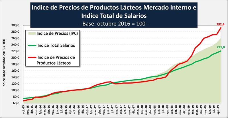 El gráfico anterior se construye sobre la base de los precios por litro de leche equivalente a consumidor final que mensualmente calcula IAPUCo y el Índice de Salarios Totales: Salario Registrado (privado y público) y Salario Privado no Registrado y utilizando la metodología para el cálculo del coeficiente de variación de salarios (C.V.S.) del Decreto 1242/2002, en ambos casos se parte de un número índice igual 100 para el mes de octubre de 2016. Además se agrega un área (verde clara) que indica la evolución de la inflación (IPC).