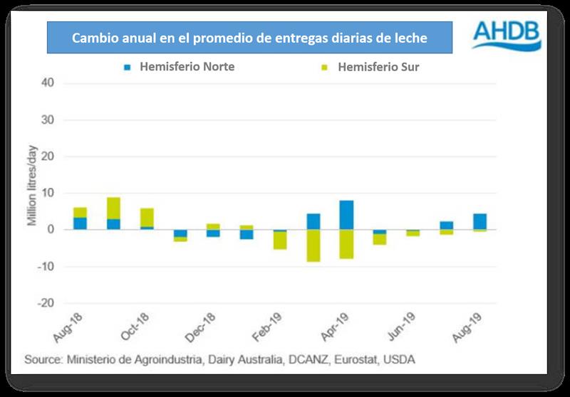 Como puede verse en el gráfico adjunto de la AHDB, este crecimiento mundial es por el hemisferio norte. En el hemisferio sur, la producción este año ha sido menor que el año anterior, con diferentes reducciones según los meses. La sequía ha sido una de las responsables de este descenso.