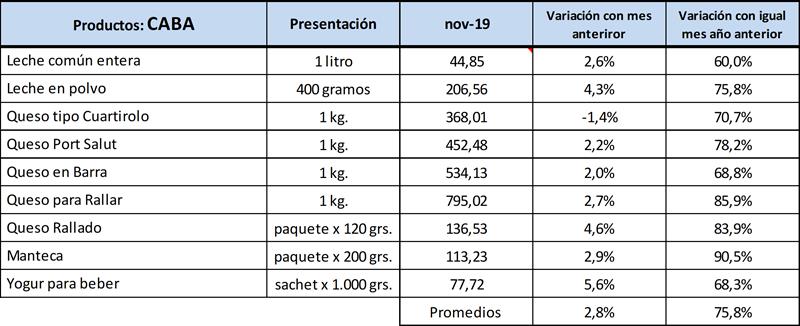 Según datos publicados por la Dirección General de Estadísticas y Censos - Ministerio de Hacienda del Gobierno de la Ciudad de Buenos Aires, los precios de los productos lácteos de esta canasta, tuvieron un crecimiento mensual promedio simple del 2,8% e interanual del 75,8%.