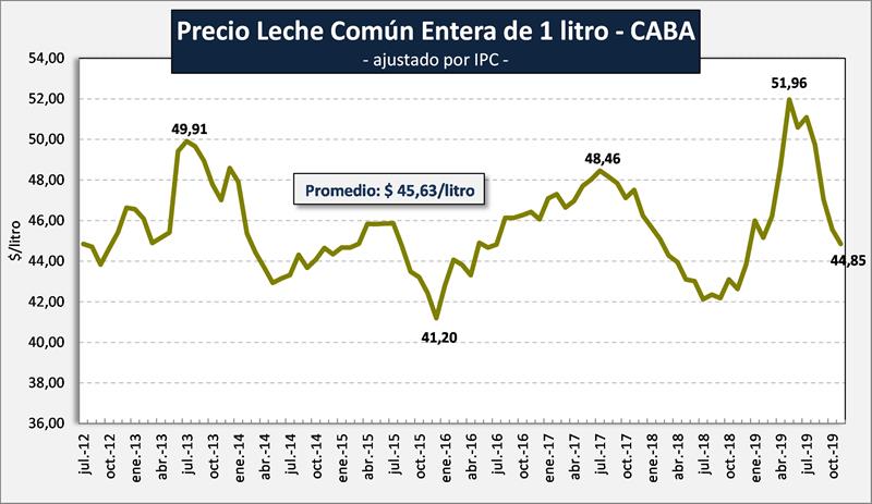 En el gráfico siguiente se toma como referencia un producto básico como la leche común entera por litro, en este caso de CABA por contar con una serie un poco más prolongada en el tiempo y se la actualiza por el índice de precios al consumidor, observándose que el precio de noviembre 2019 se encuentra en un valor inferior del promedio del toda la serie y dos efectos de baja en los últimos meses, desaceleración en el aumento de precios (inferiores a la inflación) y la incidencia de IVA cero en este producto.