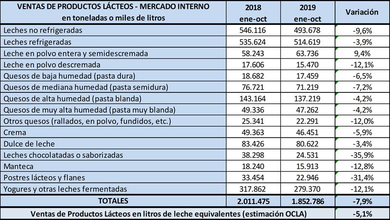 En el cuadro se observa una reducción del 5,1% en los litros equivalentes vendidos en el mercado interno durante el período enero-octubre 2019 respecto a igual período del año anterior. La mayor reducción se observa en los productos de mayor valor agregado y/o unitario, tales como leches no refrigeradas, quesos procesados, leches saborizadas, yogures, flanes y postres.