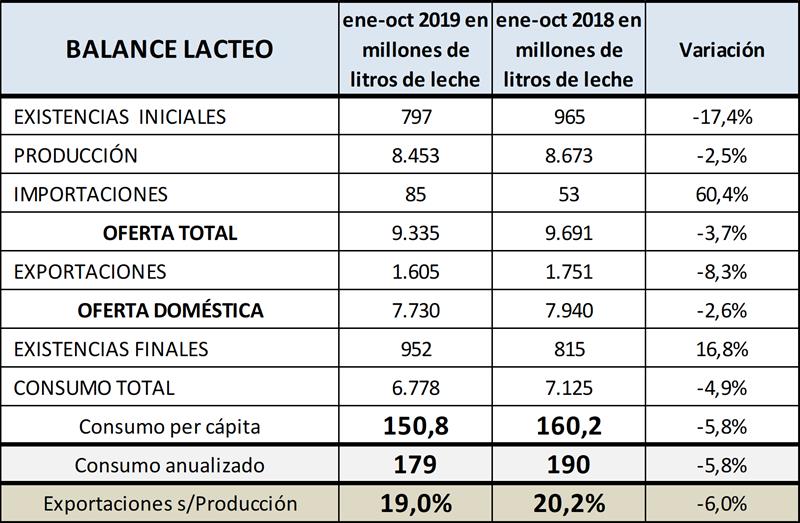 El balance lácteo arroja las siguientes cifras a octubre de 2019: