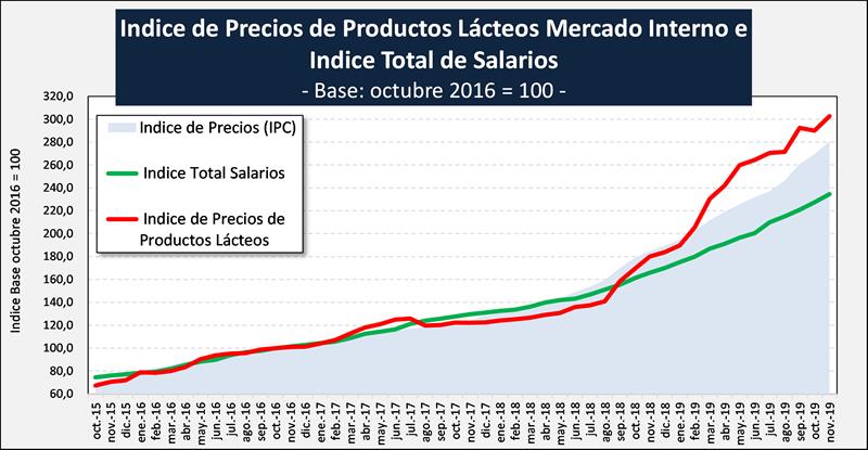 El gráfico anterior se construye sobre la base de los precios por litro de leche equivalente a consumidor final que mensualmente calcula IAPUCo y el Índice de Salarios Totales: Salario Registrado (privado y público) y Salario Privado no Registrado y utilizando la metodología para el cálculo del coeficiente de variación de salarios (C.V.S.) del Decreto 1242/2002, en ambos casos se parte de un número índice igual 100 para el mes de octubre de 2016. Además se agrega un área (verde clara) que indica la evolución de la inflación (IPC).