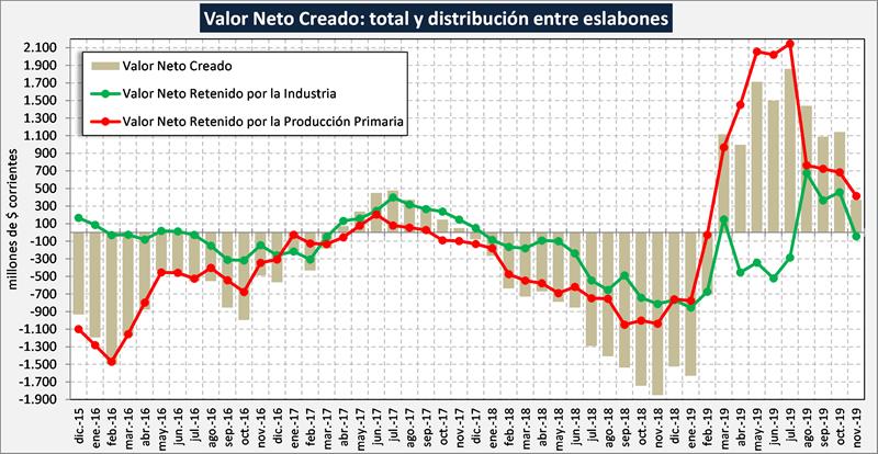 Como ya indicamos más arriba, el Valor Neto de la Cadena fue positivo en $ 371 millones lo que lleva la mejora interanual a $ 2.222 millones porque en noviembre de 2018 la pérdida había sido de $ 1.851 millones.
