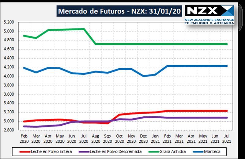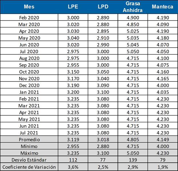Se puede observar en ésta jornada una notable baja, sobre todo para leche en polvo entera entre los meses de julio a septiembre de 2020 del orden de los US$ 150 por tonelada, lo que le agrega gran volatilidad al mercado (coeficiente de variación). Además y como no ocurría desde hace muchos años, valores de leche en polvo descremada por encima de los precios de la leche en polvo entera.