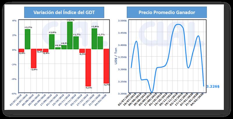 El comercio mundial de productos lácteos del 4 de febrero registró una disminución en los precios de LPD (-4,2%) y LPE (-6,2%), y un ligero aumento en los precios de la mantea (+ 0,2%), en comparación con subasta anterior. La variación general fue de -4,7%, registrando el precio promedio más bajo desde septiembre pasado.