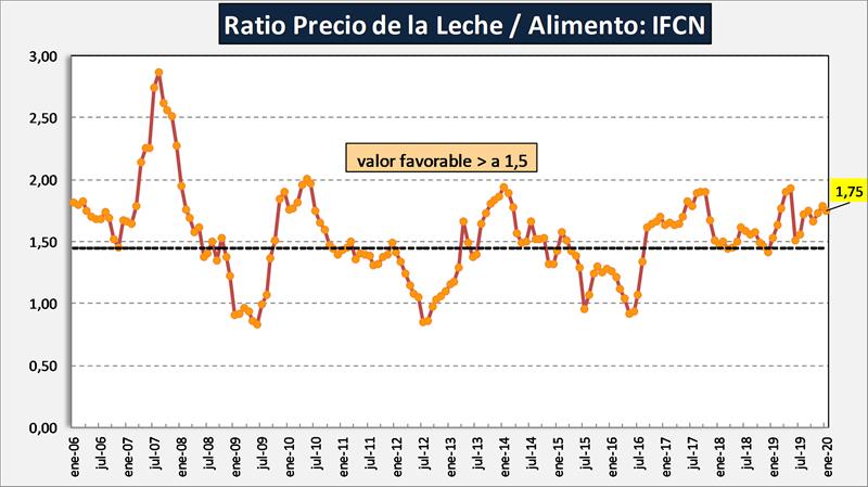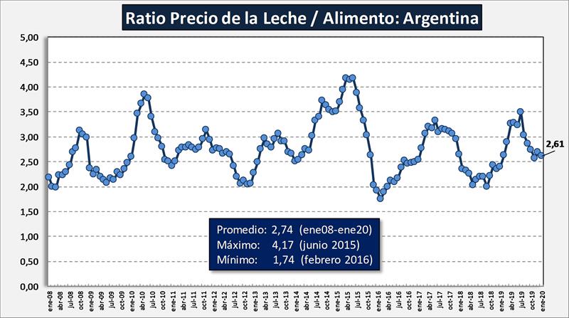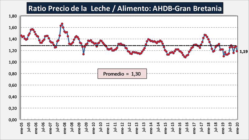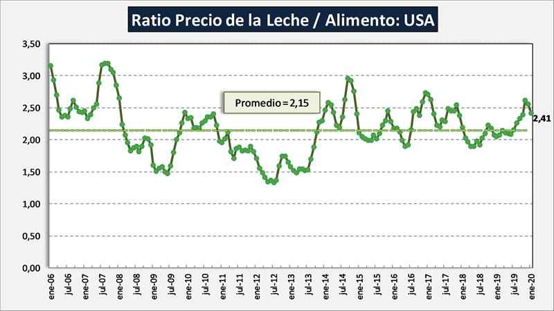 Algunos ratios de precios de la leche y alimentos a nivel mundial 2/3/2020Relación entre el precio de la leche y los alimentos animales – IFCN ![]() En una forma simplificada, muestra cuánto alimento (kgs. de concentrado), puede comprar un agricultor después de vender un kilo de leche. Se considera favorable una relación leche/precio de los alimentos mayor a 1,5, en este caso se pueden utilizar sistemas de alto rendimiento /alta entrada. En términos simples, cuanto mayor es la proporción, más económico es usar concentrados. Relación leche/alimento: Se define como el precio de la leche dividido por el precio de los alimentos adquiridos. Son los Kilogramos de concentrados que un agricultor puede comprar después de vender un litro de leche. Entre este indicador y el precio promedio de la leche en polvo entera en el mercado mundial, hay una correlación superior a 0,70 (alta relación directa entre ambas variables). Indicador combinado mundial de precio de la leche de IFCN: Ilustra el nivel de precios del mercado mundial de la leche. Representa el precio de la leche que un procesador podría pagar a sus agricultores, si vendiera sus productos en el mercado spot mundial y produciría a costos estandarizados. Indicador de precios de los alimentos en el mundo: Harina de soja; con > = 48% de proteína, primer contrato de futuro de Chicago a plazo. Maíz; US amarillo No. 2, FOB Golfo de Estados Unidos. Cálculo: precio del maíz 70% del precio del pienso y 30% de harina de soja. Tipo de cambio: OANDA Relación entre el precio de la leche y los alimentos animales - USDA ![]() Precio de 1 litro de leche percibido por el productor. Costo de 1 kg. de Alimento (ración con 16% de proteína) compuesto por: 51 % de MAÍZ, 41 % de HENO DE ALFALFA y 8 % de SOJA. Se ven cambios significativos en la producción de leche cuando esta proporción se sale de las proporciones típicas. Por lo general, una proporción de 2,5 a 3,0 no produce cambios en la producción nacional de leche. Relación entre el precio de la leche y los alimentos animales – AHDB Dairy UK ![]() La relación entre la leche y el precio del alimento (Milk Feed Price Ratio) da una indicación de la relación entre el ingreso de leche y los costos de alimentación. Muestra el valor de la leche en comparación con el costo de los alimentos comprados. Una proporción más alta indica una mejor asequibilidad de los alimentos comprados. Los costos y precios reales para calcular el MFPR son normalmente de 2 a 3 meses desactualizados. AHDB calcula un MFPR teórico basado en los movimientos proyectados de los precios de la granja y los precios concentrados calculados. Por lo tanto, se citan dos razones, una se calcula a partir del análisis teórico y la otra se basa en los últimos números citados reales. El MFPR es solo un indicador y no un reemplazo para el análisis de los costos totales de producción. La proporción aumentará si aumentan los precios de la leche de granja o si disminuyen los precios del concentrado. La proporción variará mucho de una granja a otra, según el precio de la leche alcanzado y el tipo de alimento utilizado. La relación solo debe usarse como una guía para la relación costo-ingreso en el país. Se divide el precio de la leche al productor por el precio de los alimentos. El precio de la leche utilizado es el promedio en tranquera para Gran Bretania, excluyendo las bonificaciones retrospectivas. El precio del alimento utilizado es para el alimento concentrado formulado utilizando una mezcla de trigo, cebada, harina de soja y precios directos de colza, según lo recogido por AHDB para los cereales y las semillas oleaginosas. Se agrega un costo estimado para dar cuenta de los suplementos adicionales de minerales y otros. Ratio Precio de la Leche / Alimento – Argentina ![]() Se calcula como el cociente entre el precio de la leche al productor del Panel de 18 Empresas de la DNL-MAGyP y un vector de gastos que incluye alimentación suplementaria (concentrados y silaje) y el costo de oportunidad de la tierra, ya sea propia y/o alquilada. La inclusión de este último componente, que no existe en el modelo estadounidense, se realizó por dos razones. En primer lugar, en Argentina no está disponible un precio representativo de pasturas, alimento importante en la dieta del rodeo lechero. En segundo lugar, alrededor del 50% de la superficie tambera es alquilada, gasto que aplica al corto plazo en la economía de las empresas tamberas. elaborado por el OCLA con datos del International Farm Comparison Network – IFCN, USDA NASS Dairy Market News, Agriculture and Horticulture Development Bureau – AHDB Dairy – Reino Unido y Ratio OCLA sobre información de Margen de Referencia de INTA – Universidad Austral: Gastaldi L., Galetto A. y Lema D.