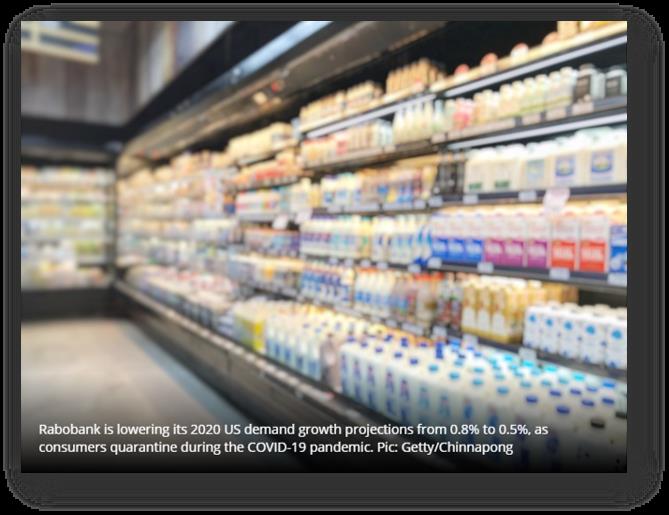 Rabobank está reduciendo sus proyecciones de crecimiento de la demanda de EE. UU. para 2020 del 0,8% al 0,5%. El final de febrero trajo una de las peores semanas en la historia del mercado de valores de EE. UU., lo que provocó un recorte en las tasas de interés a corto plazo. Esto podría resultar en precios más bajos de productos lácteos nacionales.