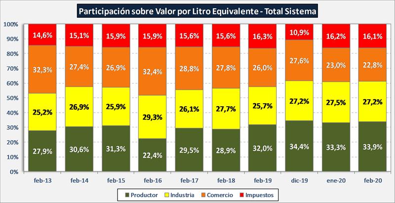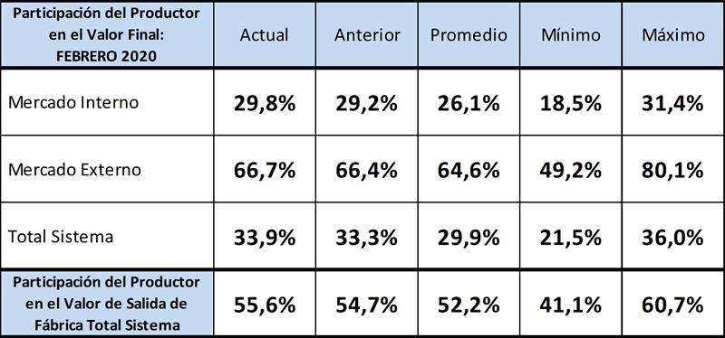 La participación del productor en el total del sistema fue para febrero 2020 del 33,9%, superior al mes anterior (máximo de la serie en junio de 2019 con el 36,0%) y bastante por encima de la media del 29,9%. Una situación similar se da para la participación en los valores finales de mercado interno. La participación del productor sobre el valor de salida de fábrica (precio al que vende la industria) fue de 55,6%, 0,9 puntos porcentuales por encima del mes anterior, y 3,4 puntos por encima de la media de la serie disponible, cabe recordar que la serie histórica para salida de fábrica es un año más extensa que las otras.