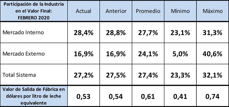 La industria empeora en febrero 2020 0,4 puntos su performance de participación en el mercado interno, en el total sistema 0,3 puntos, y en el mercado externo iguala al mes anterior y está 7,2 puntos por debajo del promedio. La facturación total de salida de fábrica por litro de leche equivalente está en US$ 0,53, 8 centavos por litro por debajo del promedio y 21 centavos menos que el máximo logrado en mayo y octubre de 2013, lo cual evidencia los problemas de competitividad que enfrenta el sector, fundamentalmente por el comportamiento de las variables económicas.