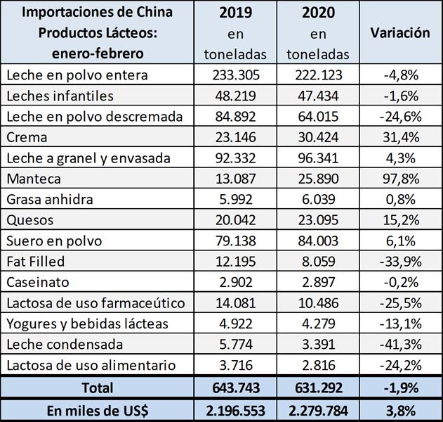 Por el contrario, se registró una disminución del 10,1% en las importaciones chinas de leche en polvo entera y leche en polvo descremada.