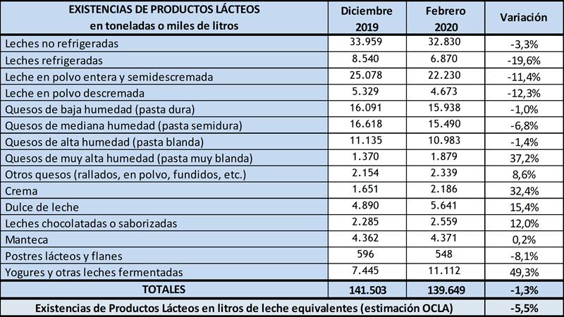 Existencias de Productos Lácteos – febrero 2020 20/4/2020