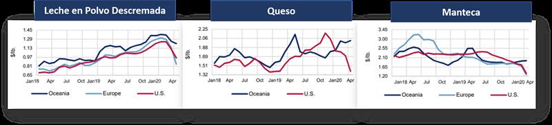 En los gráficos superiores puede verse según información del USDEC como los precios de los productos disponibles varían significativamente, según el origen. Los precios de Oceanía (sobre todo Nueva Zelanda) se encuentran tanto para leche en polvo descremada, queso y manteca muy por encima de los precios de Estados Unidos y la Unión Europea.