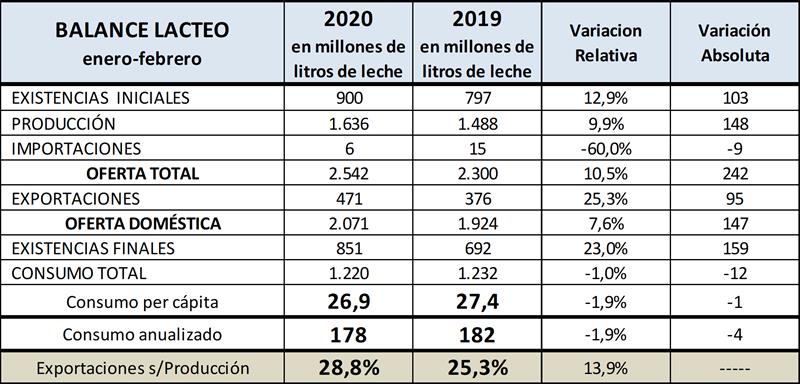 Balance Lácteo: ene-feb 2020 21/4/2020