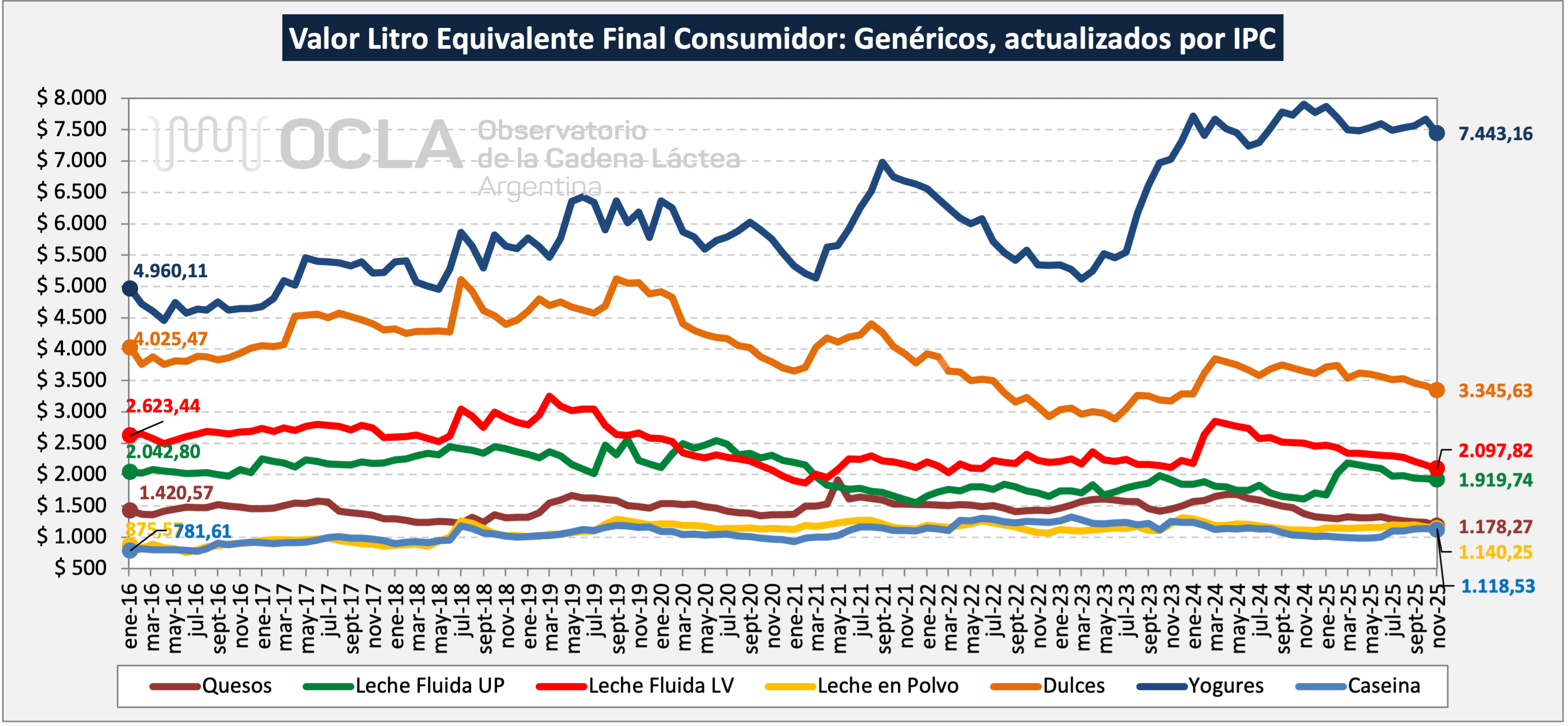 A partir de la idea de que el precio que paga un comprador expresa -de algún modo- el “valor” reconocido del bien que adquiere; el concepto de “valor por litro equivalente” (VLE) pretende exteriorizar el que le corresponde al “litro de leche cruda” en las diferentes etapas que lo convierten en un bien final de consumo. Las instancias en las que se practican las mediciones de precios son: Tranquera de productor, Planchada de industria, Consumidor final sin impuestos al consumo, Consumidor final (con impuestos al consumo). Dado que, excepto el que corresponde al de “tranquera productor”, los precios están referidos a unidades de productos diversos (quesos, leches fluidas, polvo, dulce, yogures, etc.) pero no en “litros de leche cruda”, el “VLE” traduce dichos precios en términos de los litros de leche empleados en su elaboración.