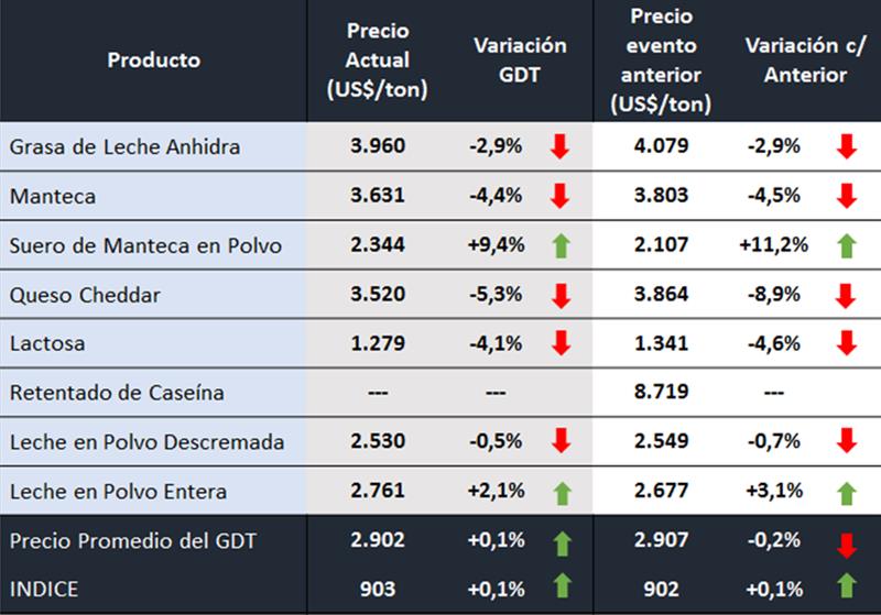 -GDT Price Index indica el promedio del cambio porcentual en los precios para cada especificación, ponderado por la cantidad de cada especificación vendida. GDT proporciona un cambio en el índice de precios de GDT del evento anterior para todos los productos, además de un equivalente para cada grupo de productos y cada combinación de grupo de productos/período de contrato. El índice de precios proporciona un reflejo más preciso de los movimientos de precios entre los eventos comerciales.