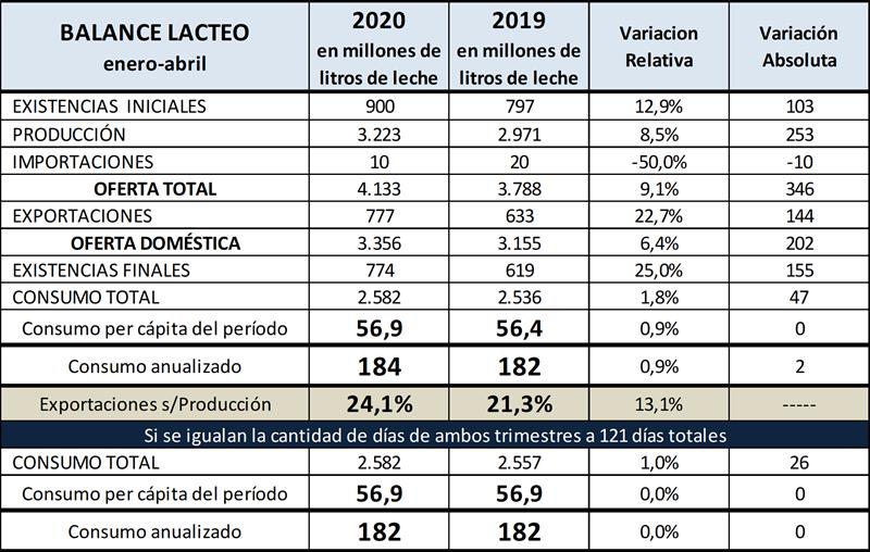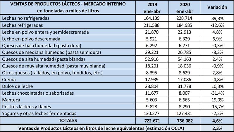 Ventas de Productos Lácteos en el Mercado Interno – abril 2020 22/6/2020Venta de Productos Lácteos en el Mercado Interno: La información proviene del Panel de industrias lácteas establecido a partir del relevamiento coyuntural de la Resolución 230/16 e información histórica de la Resolución 7/14, ambas de la SAGyP. Los valores se expresan en toneladas y miles de litros, dependiendo del tipo de producto. La conversión a litros de leche equivalente se realiza con los coeficientes establecidos en la Disposición 1/2018 de la DNL-MPyT. ![]() En el cuadro se observa un volumen de ventas superior en un 4,6% en productos y 2,3% en litros de leche equivalentes respecto a igual período del año anterior (3,8% y 1,4% respectivamente a igual cantidad de días). Si procedemos a analizar la evolución de las ventas mes a mes, y lo hacemos por la unidad de medida comparable que son los litros de leche equivalentes (litros necesarios para producir los productos elaborados), vemos que en enero las ventas cayeron 5,3%, en febrero 2,7% (a igual cantidad de días), subieron 7,6% en marzo, y 5,7% en abril, claramente las dos últimas cifras se correlaciona con las denominadas compras de pánico ocurridas en la segunda quincena de marzo e inicios de abril. Ya se ve un menor crecimiento en abril y según los datos disponibles, en mayo y lo que va de junio, las ventas retomaron un ritmo similar al que presentaron a principios del año (información de Consultoras de Mercado Interno e Industrias Lácteas consultadas por OCLA). Como ya lo venimos indicando en informes anteriores existe una caída importante en las ventas de los productos con mayor valor agregado y/o unitario, tales como yogures (salvo bebibles de litro), flanes y postres, leches saborizadas y quesos de pasta semidura o muy alta humedad. Producto de las compras para stock familiar y por los controles de precios, se visualiza un incremento significativo en las leches no refrigeradas y una situación similar en manteca, dulce de leche, quesos cremosos y yogures bebibles de litro. En base al Balance Lácteo estimado por OCLA a abril del 2020 surge un consumo total del 1,8% superior al año anterior, el consumo per cápita para el 1° cuatrimestre del 2020 es de 56,9 litros/habitante de leche equivalente, que anualizado arroja un valor de 184 litros, 0,9% por encima del registro del año 2019, y de 182 litros, igual al año anterior, si consideramos la misma cantidad de días para ambos cuatrimestres. Las cifras que arroja la metodología del Balance Lácteo son muy similares a las de ventas totales del cuadro superior (Resolución 230/16). ![]() Respecto a los datos que captura la Resolución 230/16 es el de aquellas empresas que muy probablemente hayan incrementado sus ventas en los meses de pandemia/cuarentena y las industrias que han sufrido fuertes caídas en sus ventas (incluso algunas que dejaron de procesar) no estén registradas ni en el período previo ni durante la cuarentena y por lo tanto estas cifras pueden indicar un nivel de ventas superior al real de todo el mercado (100% de la leche procesada y comercializada en el mercado doméstico). Otro dato relevante, corresponde a leches no refrigeradas ya que en la muestra hay una empresa con datos completos en el período ene-abr 2020 pero que no cuenta con datos completos en el cuatrimestre del año anterior. Gráfico1: evolución mensual de las Ventas en el Mercado Interno por grupo de productos ![]() Gráfico 2: evolución de las Ventas en el Mercado Interno en base a productos totales y tomando como Base = 100 enero de 2018 ![]() elaborado por el OCLA con información de INDEC y DNL-MAGyP